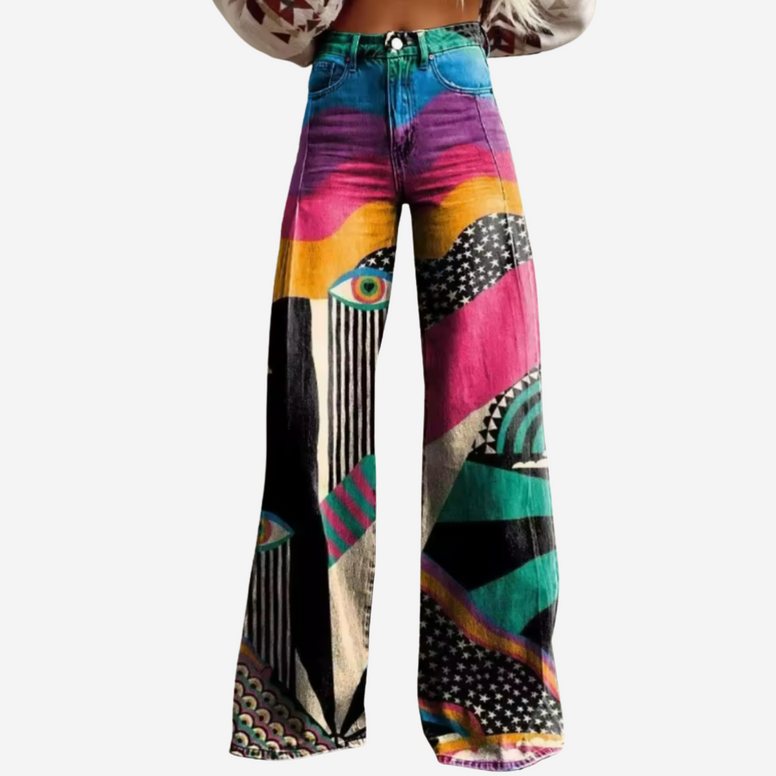 Ces pantalons larges à taille haute allient confort et style avec une touche bohème et ludique. Parfait pour tout, des festivals de musique aux sorties en café – ou juste pour ces jours où vous avez besoin d'un peu plus de couleur dans votre vie.