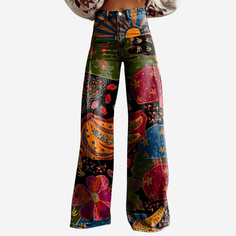 Ces pantalons larges à taille haute allient confort et style avec une touche bohème et ludique. Parfait pour tout, des festivals de musique aux sorties en café – ou simplement pour les jours où vous avez besoin d'un peu plus de couleur dans votre vie.